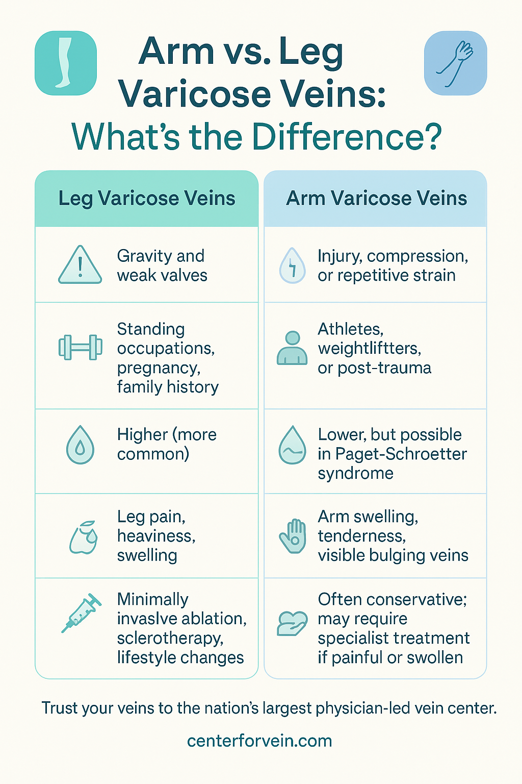 Varicose veins in the legs occur when weakened valves fail to push blood upward against gravity, causing pooling and pressure buildup. In the arms, varicose veins more often stem from repetitive strain, trauma, or vein compression—conditions that can affect athletes, manual laborers, or anyone with upper-body overuse.
